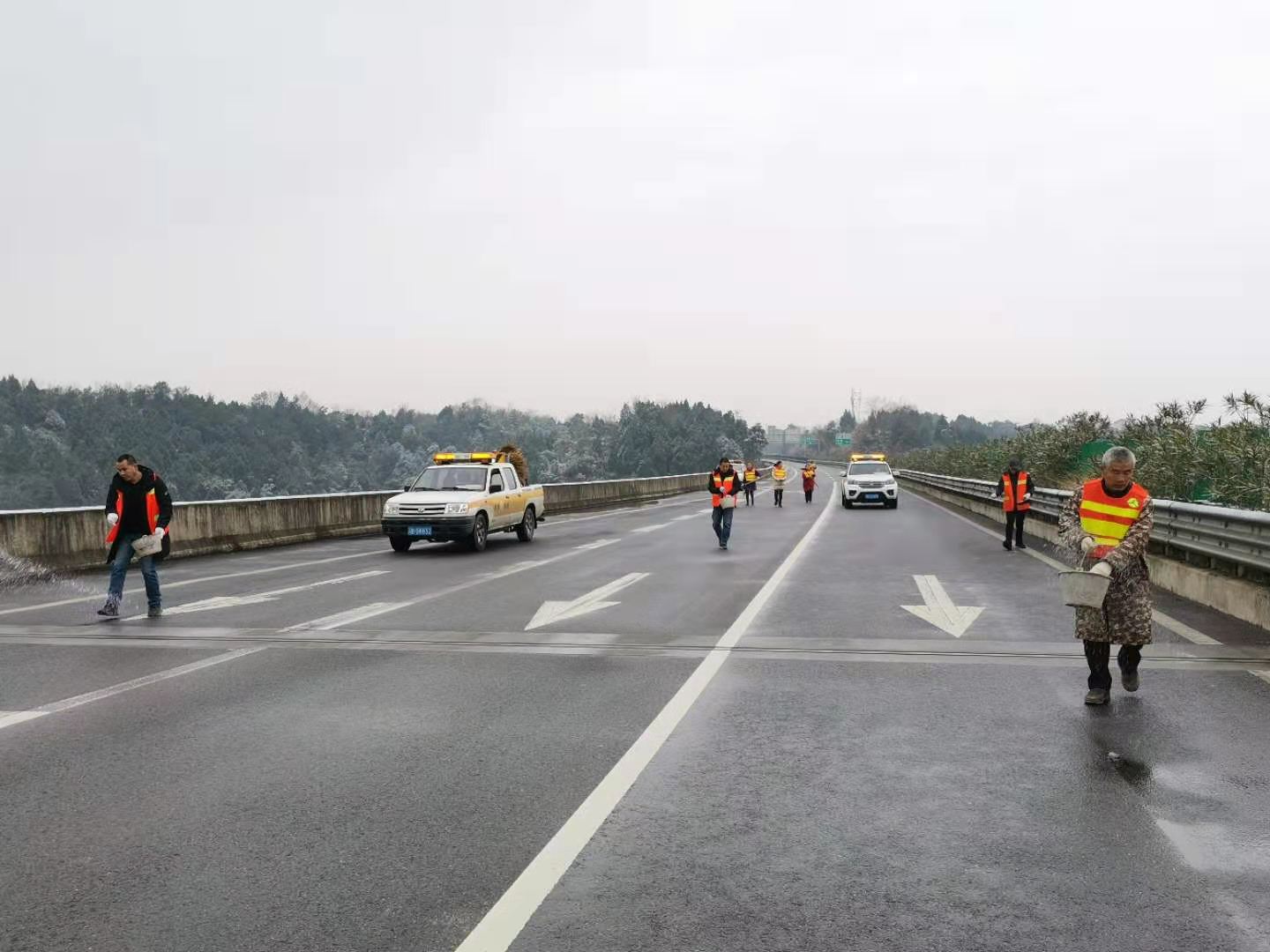 為防止路面結(jié)冰引發(fā)交通事故,確保過往行人和車輛安全,1月8日至12日,路橋公司下屬養(yǎng)護(hù)公司購買了大量工業(yè)用鹽,及時組織10余名工作人員對管養(yǎng)范圍內(nèi)的綿遂高速公路結(jié)冰路面逐一進(jìn)行除冰處置,并在結(jié)冰路段前設(shè)置了警示標(biāo)志和警示錐錐桶,及時的提醒了過往車輛減速慢行,此次累計清理結(jié)冰路面約10公里。同時,路橋公司對管養(yǎng)范圍內(nèi)的六條國省干線加強(qiáng)巡查,謹(jǐn)防路面結(jié)冰,遇到險情及時采取管控措施,為廣大市民出行安全保駕護(hù)航。