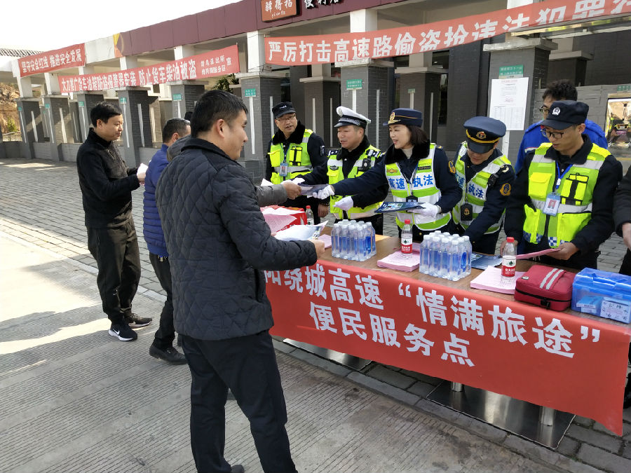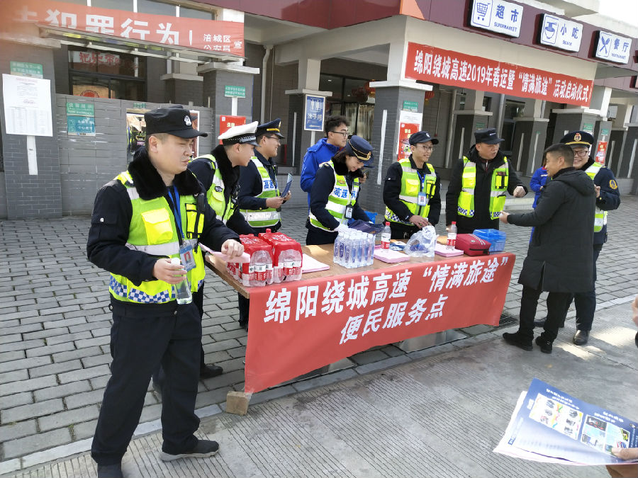 1 月 21 日,綿陽(yáng)繞城高速管理所聯(lián)合高速交通執(zhí)法、高速交警 在綿陽(yáng)南服務(wù)區(qū)舉行了綿陽(yáng)繞城高速 2019 年春運(yùn)暨“情滿旅途” 活動(dòng)啟動(dòng)儀式。儀式現(xiàn)場(chǎng)設(shè)立了“春運(yùn)安全 情滿旅途”宣傳點(diǎn) 和便民服務(wù)點(diǎn),積極開(kāi)展了咨詢引導(dǎo)、秩序維護(hù)、便民利民、應(yīng) 急救護(hù)等便民服務(wù)工作,主動(dòng)為過(guò)往司乘人員特別是農(nóng)民工提供 開(kāi)水藥品、交通咨詢、車(chē)輛維修、應(yīng)急救援等暖心服務(wù),充分讓農(nóng)民工兄弟感受到回鄉(xiāng)返崗旅途的溫暖,增進(jìn)了人民群眾對(duì)綿陽(yáng) 繞城高速春運(yùn)服務(wù)的獲得感和認(rèn)同感。為確保綿陽(yáng)繞城高速春運(yùn) 期間安全營(yíng)運(yùn)奠定了堅(jiān)實(shí)的基礎(chǔ)。
