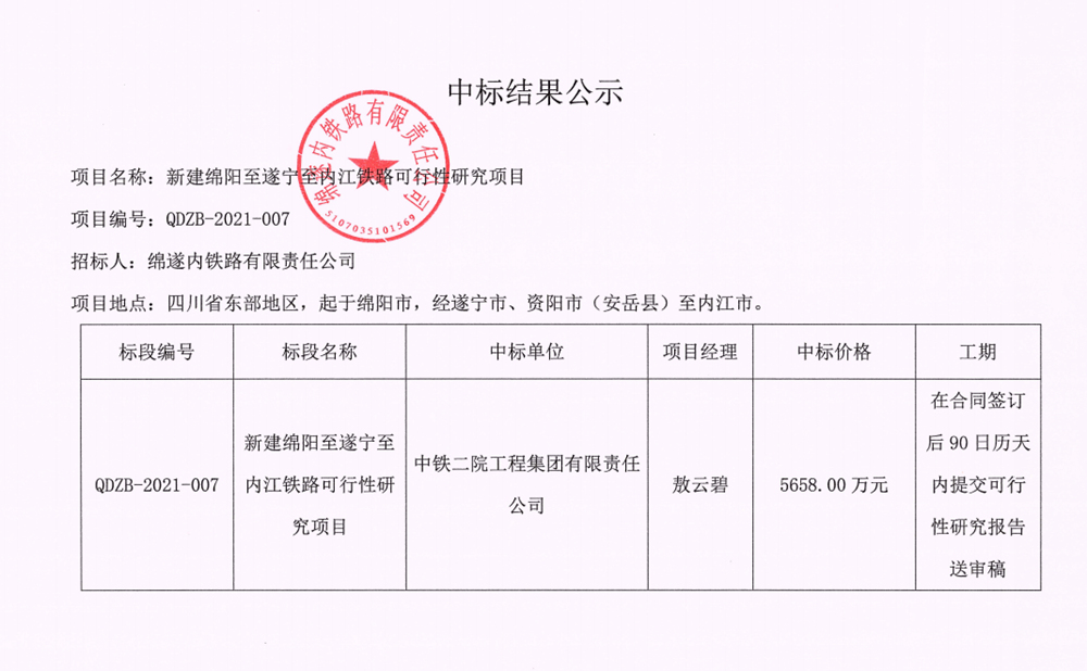新建綿陽至遂寧至內(nèi)江鐵路可行性研究項(xiàng)目中標(biāo)結(jié)果公示