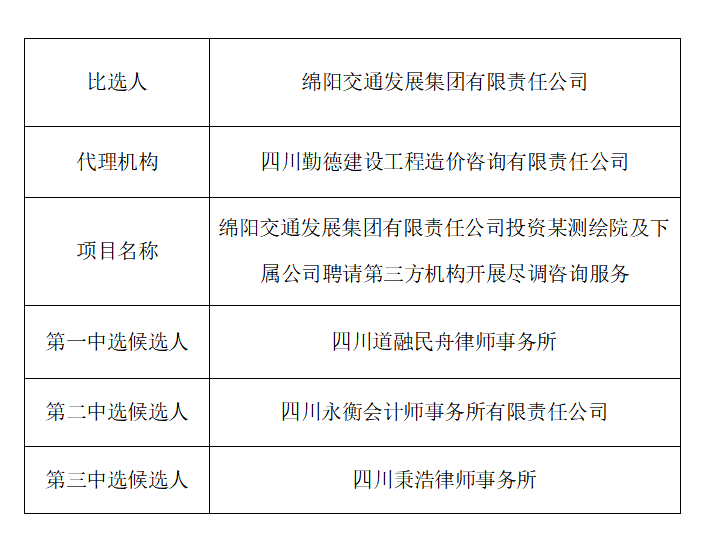 綿陽(yáng)交通發(fā)展集團(tuán)有限責(zé)任公司投資某測(cè)繪院及下屬公司聘請(qǐng)第三方機(jī)構(gòu)開(kāi)展盡調(diào)咨詢服務(wù)中選候選人公示