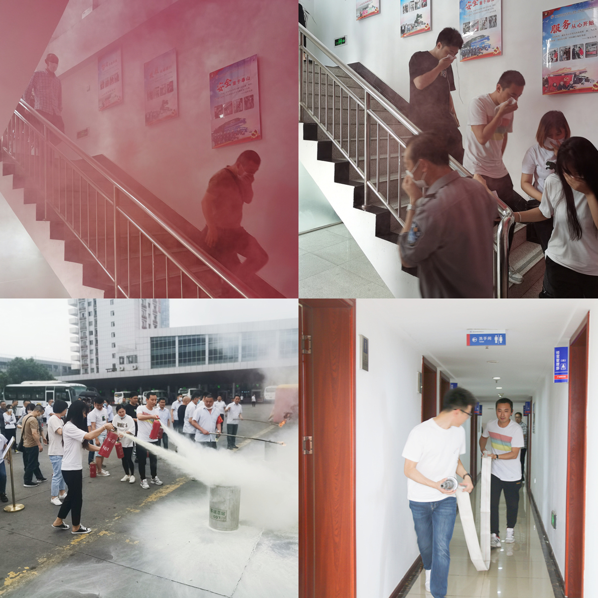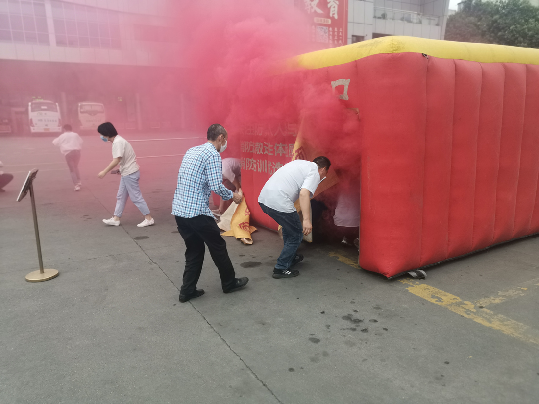 ? ? ? ?15時(shí)30分,演練正式開始。在李松的現(xiàn)場(chǎng)指導(dǎo)下,參訓(xùn)職工聽到警報(bào)后按照預(yù)案和分工,迅速疏散人員,用濕毛巾捂住口鼻,彎腰穿越模擬濃煙霧區(qū),從樓層兩側(cè)安全出口迅速有序撤離至安全區(qū)。