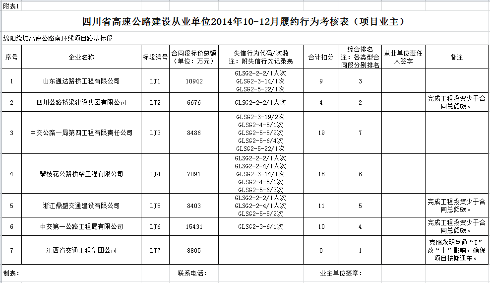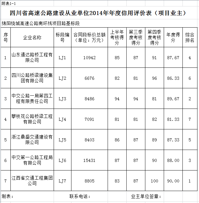 綿陽繞城高速公路南環(huán)線建設路基單位2014年年度信用評價和2014年第四季度履約行為考核結(jié)果公示