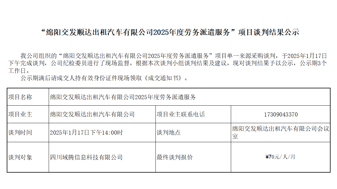 “綿陽交發(fā)順達出租汽車有限公司2025年度勞務(wù)派遣服務(wù)”項目談判結(jié)果公示