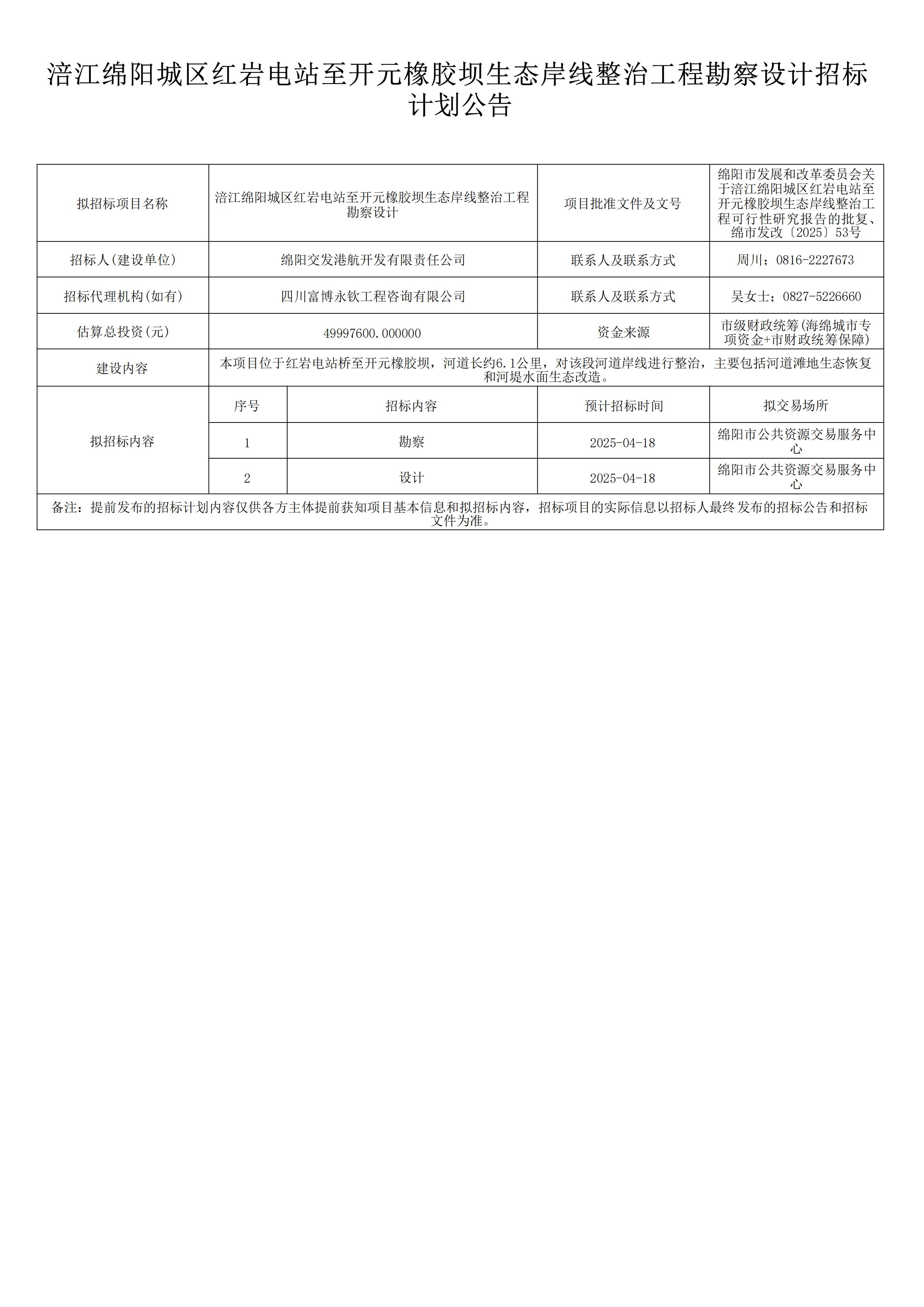 涪江綿陽城區(qū)紅巖電站至開元橡膠壩生態(tài)岸線整治工程勘察設(shè)計招標計劃公告
