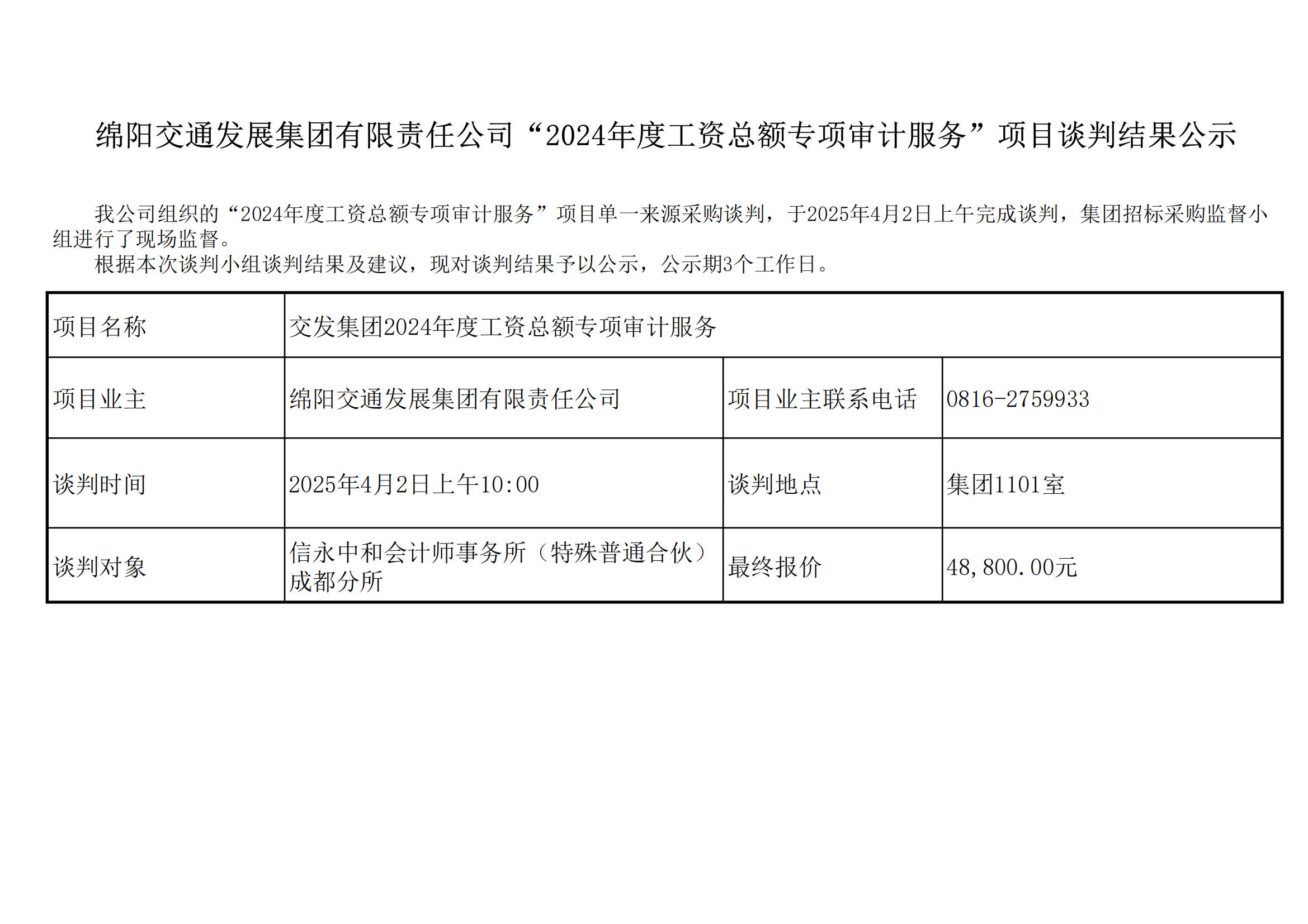 綿陽交通發(fā)展集團(tuán)有限責(zé)任公司“2024年度工資總額專項(xiàng)審計(jì)服務(wù)”項(xiàng)目談判結(jié)果公示