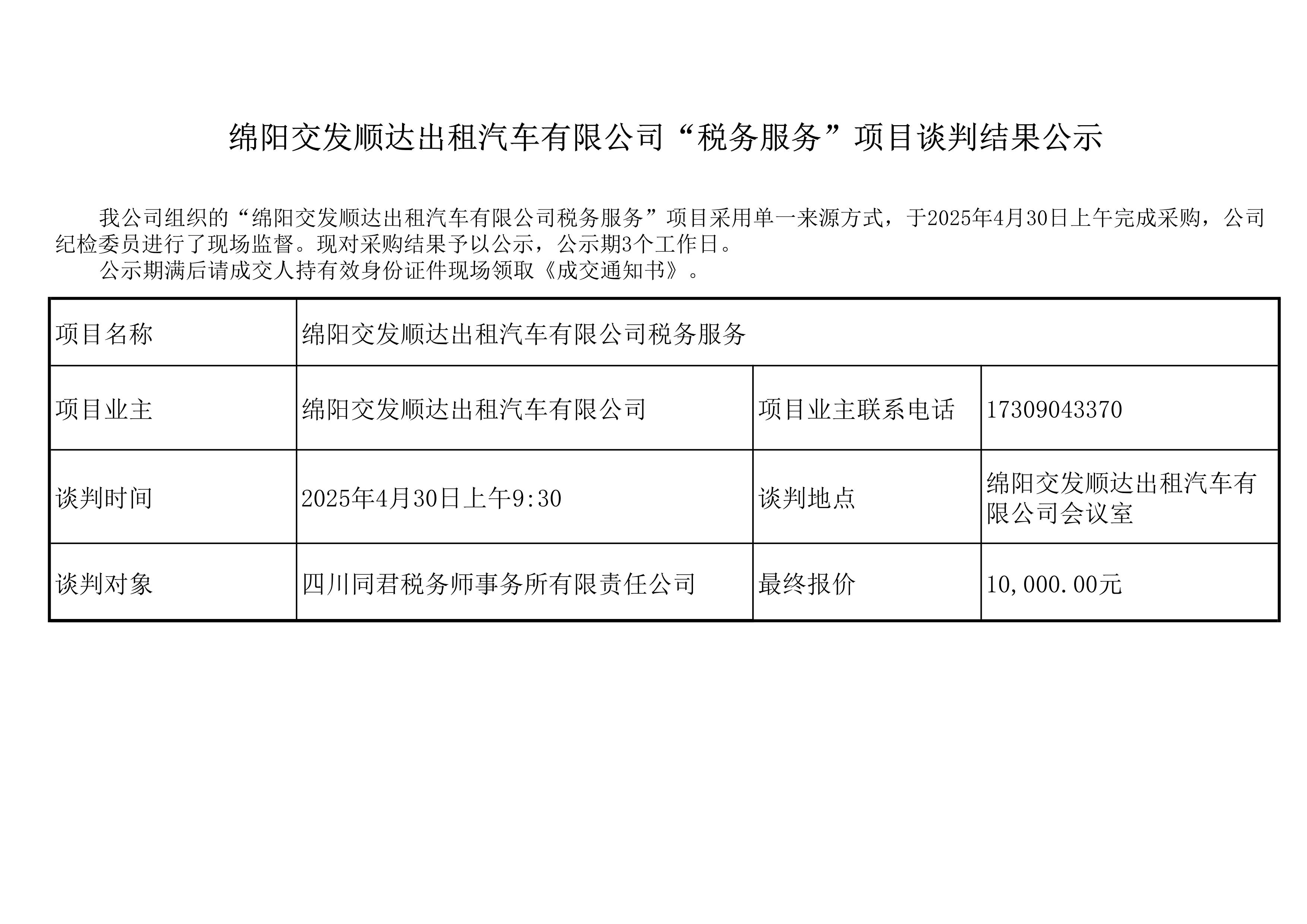 綿陽交發(fā)順達(dá)出租汽車有限公司“稅務(wù)服務(wù)”項(xiàng)目談判結(jié)果公示