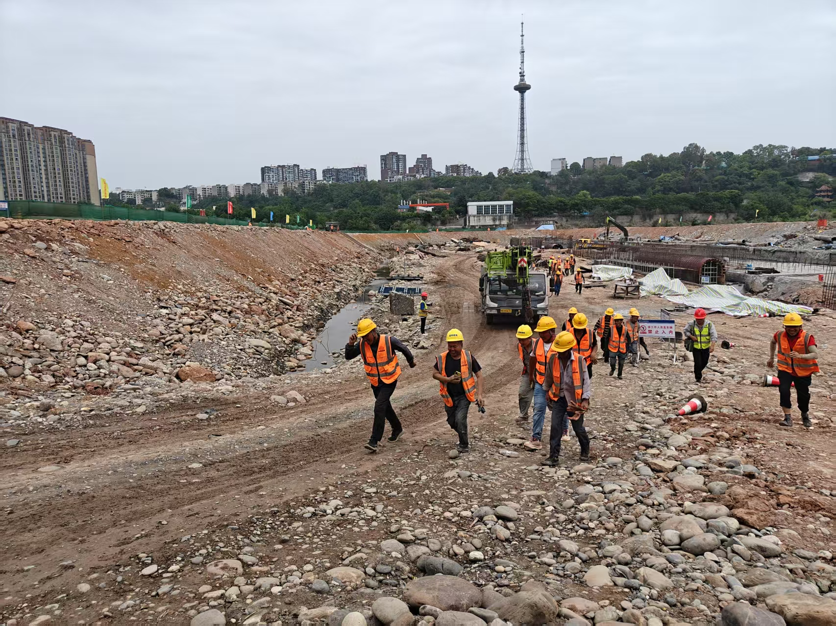 此次演練模擬極端天氣下涪江水位驟漲的突發(fā)險情,重點開展人員疏散及施工機械撤離等科目的實戰(zhàn)演練。隨著演練開始信號發(fā)出,項目通訊聯(lián)絡(luò)組高效傳達指令,應(yīng)急搶險、醫(yī)療救護、警戒疏散等五個應(yīng)急小組聞令而動,展開一場與時間賽跑的防汛搶險攻堅戰(zhàn)。