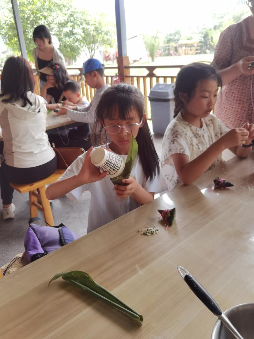 粽葉飄香傳古韻,巧手編織愛國情。在氤氳的茶香尚未散去時,一場別開生面的端午包粽活動又將親子互動的暖意推向高潮。孩子們圍坐在鋪滿青綠粽葉的木桌前,聆聽志愿者講述屈原的愛國故事與端午習俗,稚嫩的臉龐上寫滿對傳統(tǒng)文化的向往。家長手把手教孩子將糯米與紅豆填入粽葉,折葉、纏線、打結(jié),每一個步驟都流淌著千年的文化血脈。當棱角分明的粽子在孩子們掌心誕生時,他們不僅學會了傳統(tǒng)技藝,更在粽葉的清香中觸摸到“家國情懷”的深刻內(nèi)涵?;顒蝇F(xiàn)場,五彩絲線纏繞的粽子與茶園蒼翠相映成趣,愛國精神與文化傳承如同粽米般緊密相融,在親子協(xié)作間代代相傳。
