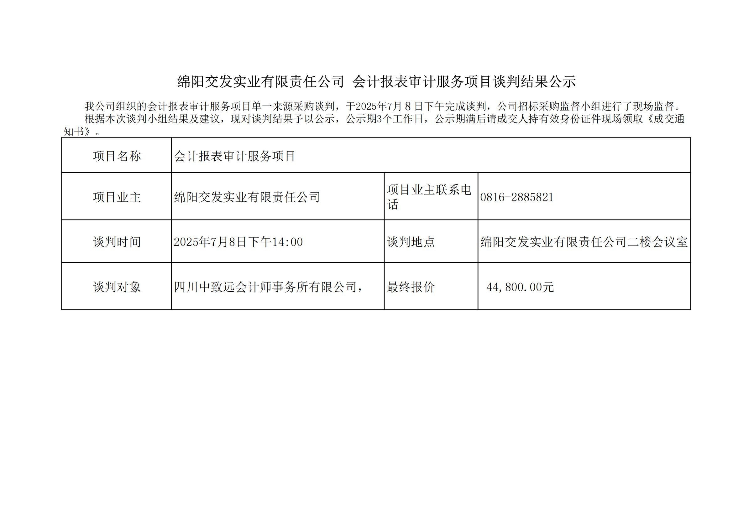 綿陽交發(fā)實業(yè)有限責(zé)任公司會計報表審計服務(wù)項目談判結(jié)果公示