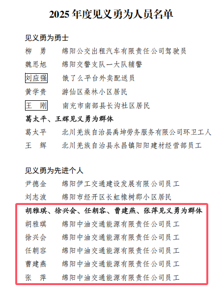 近日,綿陽市人民政府發(fā)布《關(guān)于對2025年度見義勇為人員進(jìn)行獎勵的決定》,運(yùn)業(yè)集團(tuán)所屬綿陽中油交通能源有限責(zé)任公司胡雅琪、徐興會、任朝容、曹建燕、張萍五位員工獲見義勇為群體表揚(yáng)。她們在轎車自燃危機(jī)中挺身而出的英勇事跡,不僅為城市安全筑起“防護(hù)墻”,更以實(shí)際行動詮釋了國企員工的責(zé)任擔(dān)當(dāng),譜寫了新時代“她力量”的動人篇章。