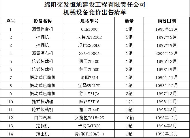 綿陽交發(fā)恒通建設(shè)工程有限責(zé)任公司關(guān)于競價(jià)出售舊機(jī)械設(shè)備的公告